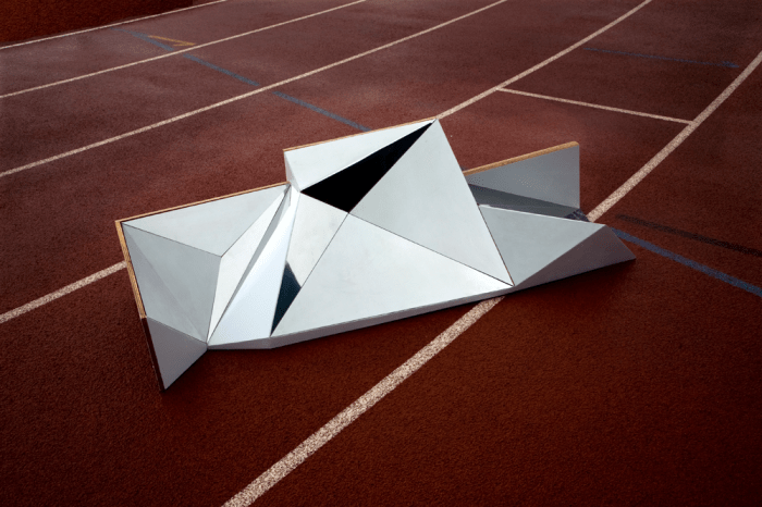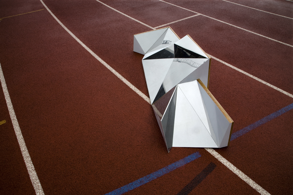 The standing surfaces of this podium are designed in the various angles disabling normal stepping onto it and standing victoriously erect. They are plated with mirroring steel.