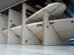 The measurements of the boards are taken to cut individual slots for each one. The size of the room was taken in the consideration when the slots were designed. Therefore taking the boards out for the next surf-trip is no problem.