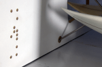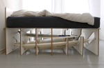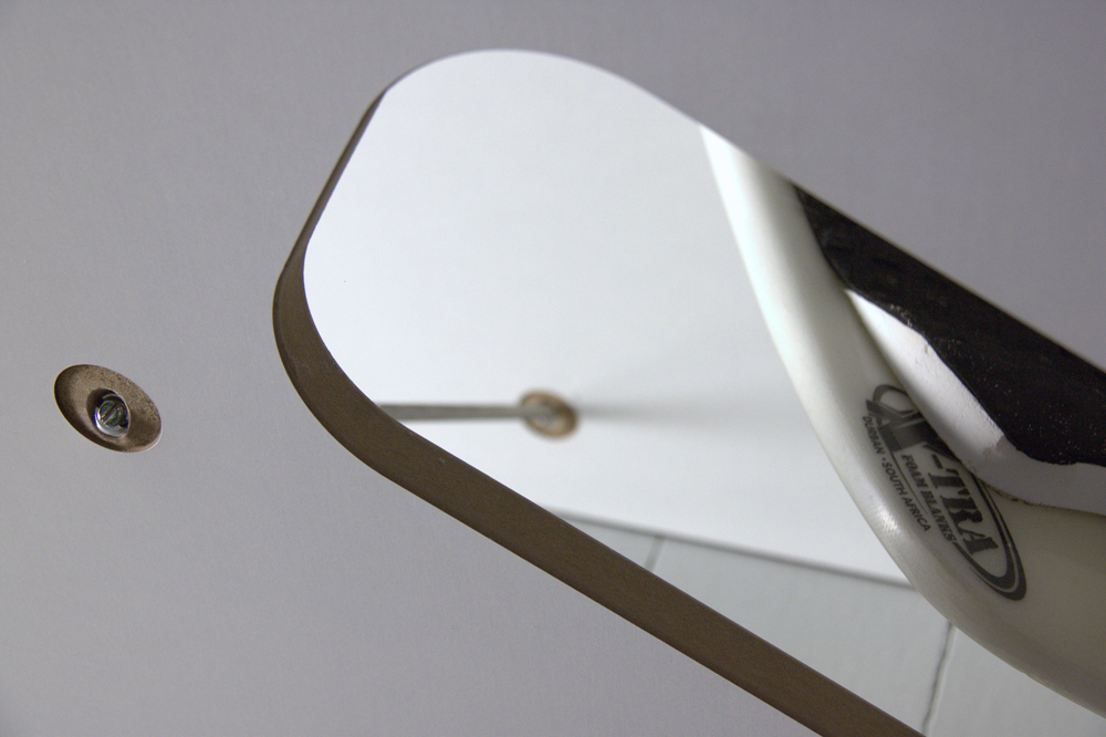 To stabilize the bed the sheets are fixed to each other with threaded metal rods  – the direction of them offers a contrast to the orientation of the surfboards. Further stability of the bed is provided by a purpose-built slatted frame. Each sheet slots into the predetermined holes on the slatted frame.