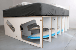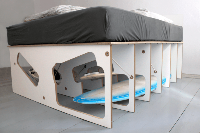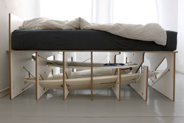 This bed has two special features: It sits on seven sheets and stores four surfboards. Each surfboard penetrates the bed from different angle.